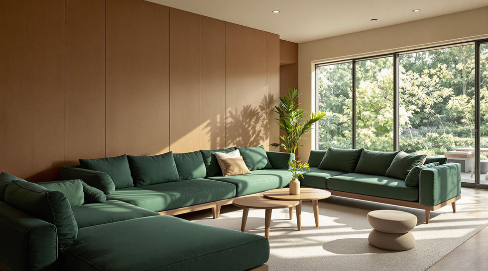 A sustainable living room designed with reclaimed wood furniture, eco-friendly fabrics, and non-toxic paints. The space features energy-efficient lighting and ample natural light, creating a warm and healthy environment without sacrificing style.